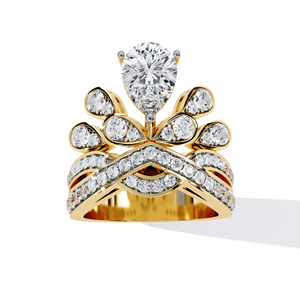 This exquisite 14K engagement ring showcases a brilliant pear-cut diamond surrounded by a crown-like halo of sparkling round diamonds. The intricate split-shank band features a double row of pavé-set stones, adding depth, brilliance, and royal elegance perfect for the bride who loves timeless luxury.