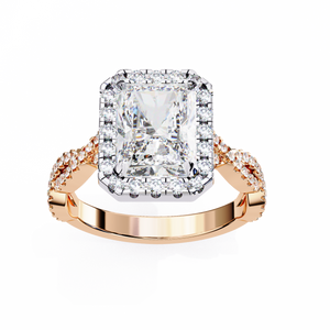 This 14K Radiant Cut Twisted Halo Diamond Engagement Ring is a perfect fusion of brilliance and artistry. The radiant-cut center stone is encircled by a shimmering halo, enhancing its fire and luminosity. The twisted pava band symbolizes two lives beautifully intertwined, adding depth and romance to its design. Crafted for lasting beauty and meaning, this ring represents eternal love sophisticated, sparkling, and unforgettable.