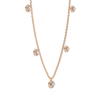 A timeless 14K gold necklace featuring round bezel-set diamonds evenly spaced along a delicate chain. The floating diamond design adds subtle sparkle and modern elegance, perfect for layering or wearing solo for a minimalist statement.