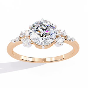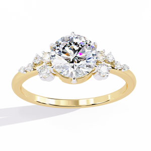 This 14K engagement ring features a brilliant round center diamond complemented by delicate cluster side stones that add sparkle and depth. The balanced symmetry and refined craftsmanship create a timeless look perfect for brides seeking a romantic yet modern symbol of love and commitment.