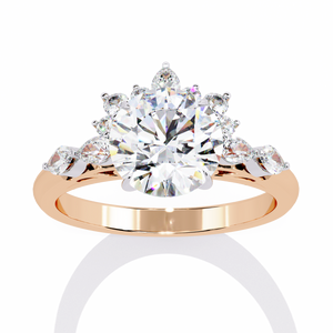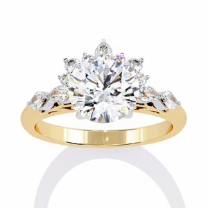 This 14K engagement ring features a dazzling round center diamond accented by a beautiful floral-inspired arrangement of side stones. The intricate setting and smooth band highlight fine craftsmanship, creating a design that radiates elegance and charm. Perfect for brides who appreciate both classic beauty and modern sophistication, this piece symbolizes eternal love in its purest form.