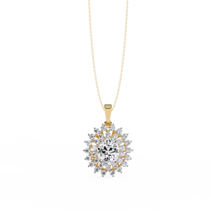 This radiant 14K gold pendant features a stunning round diamond encircled by a halo of shimmering stones in a sunburst design. Symbolizing light and energy, it brings brilliance and timeless elegance to any look.