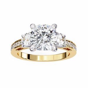 This 14K diamond engagement ring features a captivating three-stone design symbolizing the past, present, and future of your love. A brilliant round-cut center diamond is flanked by two dazzling side stones, enhanced by a pave diamond band for added brilliance. Expertly crafted with timeless elegance, this ring embodies sophistication, sparkle, and lasting beauty.