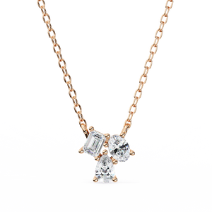This captivating 14K gold pendant showcases a trio of diamonds pear, oval, and emerald cuts beautifully arranged in harmony. A statement of artistry and brilliance, perfect for modern elegance with a hint of uniqueness.